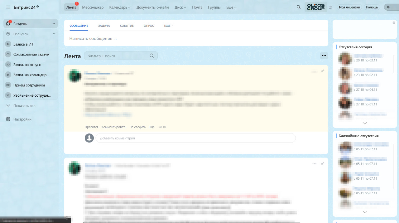 OLDOS GROUP — динамично развивающаяся компания, ориентированная на эффективное управление внутренними процессами и цифровизацию рабочих задач. До внедрения корпоративного портала сотрудники компании использовали разрозненные инструменты, такие как Skype и Google Docs, что приводило к дублированию информации и снижению прозрачности работы.