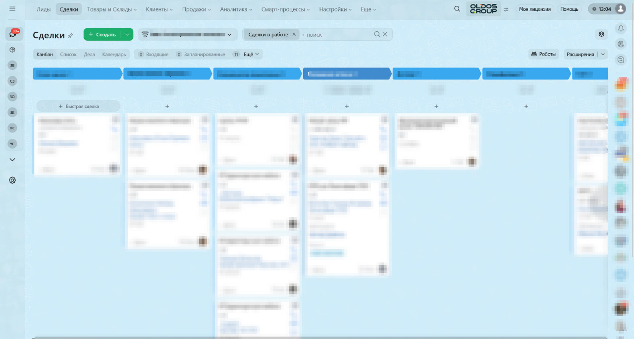 CRM реализовано направление «Ткани» (продажа тканей и фурнитуры) с импортом компаний и контактов, автоматизацией звонков и обработки писем. В CRM ведется работа с базой клиентов, где указаны ответственные менеджеры, фиксируется потоки новых лидов и формируются сделки. В карточке клиента сохраняется вся история и настроена интеграция с почтой и вотсапом.