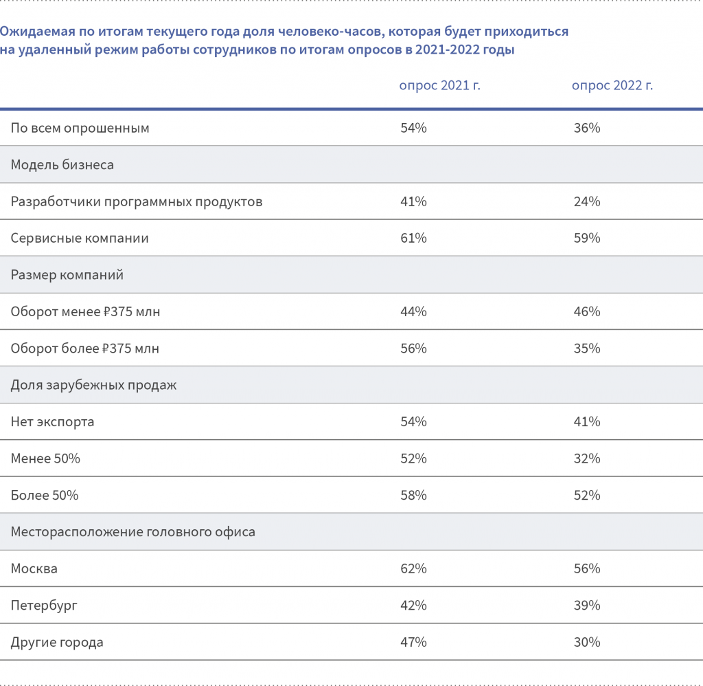 Респонденты отвечали на следующий вопрос: «Какая примерно доля человеко-часов, согласно Вашим прогнозам, будет приходиться на удаленный режим работы Ваших сотрудников в 2022 году?» (годом ранее речь шла о 2021 г.). Таким образом ответы отражали текущую ситуацию и ожидания того, как она будет меняться в течение года.