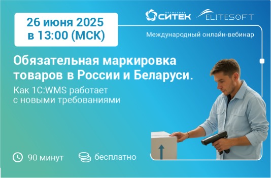 26 июня в 13:00 состоится вебинар «Обязательная маркировка товаров в России и Беларуси. Как 1С:WMS работает с новыми требованиями». В качестве организатора мероприятия выступает компания СИТЕК, которая входит в состав РУССОФТ.