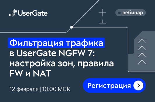 12 февраля состоится второй вебинар обучающей серии по работе с UserGate NGFW «Фильтрация трафика в UserGate NGFW 7: настройка зон, правила FW и NAT», посвящённый настройке зон, правилам межсетевого экрана и базовым сценариям NAT. Участники разберут принципы фильтрации входящего и сквозного трафика, научатся структурировать сеть с помощью зон, создавать и анализировать правила межсетевого экрана, а также работать с журналами событий. В завершение будет рассмотрен простой базовый сценарий SNAT для организации выхода трафика в интернет. В качестве организатора вебинара выступает компания UserGate, которая входит в состав РУССОФТ.