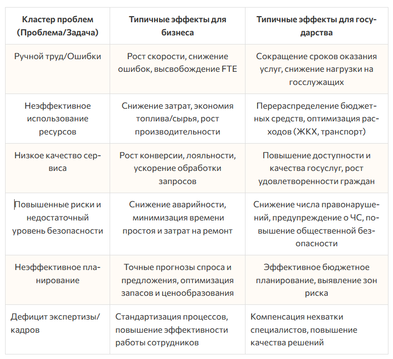Анализ эффектов показывает, что несмотря на разнообразие отраслей и технологий, результаты внедрений укладываются в достаточно четкую модель. ИИ применяется не ради имитации инноваций, а как инструмент, который должен дать измеримый результат — экономию и новые источники дохода, ускорение процессов, рост качества и снижение нагрузки на людей.