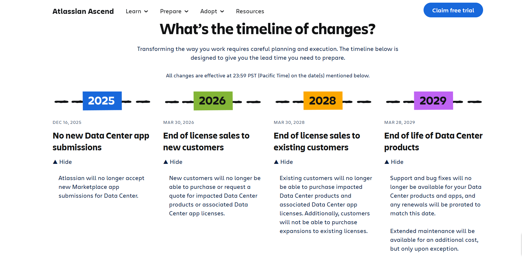 Atlassian объявил о поэтапном отказе от своих продуктов Data Center в течение следующих трех лет. С марта 2026 года компания прекратит продажи новых лицензий для Data Center. В 2028 году действующие клиенты не смогут приобретать продукты и расширять существующие лицензии. Полная поддержка версий Data Center прекратится в 2029 году, говорится в опубликованном компанией графике.