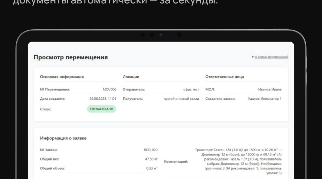 Мы внедрили заказчику AI-ассистента, который автоматизирует весь цикл перемещения ТМЦ: