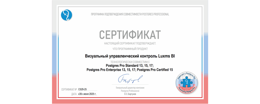 Postgres Professional, разработчик российской СУБД Postgres Pro, и ГК Luxms, вендор платформы бизнес-аналитики Luxms BI, объявляют о совместимости своих продуктов. Сертификат, выданный Postgres Professional, подтверждает корректную работу Luxms BI и Postgres Pro Enterprise (версии 13, 15, 17), Postgres Pro Standard (версии 13, 15, 17), Postgres Pro Certified 15.