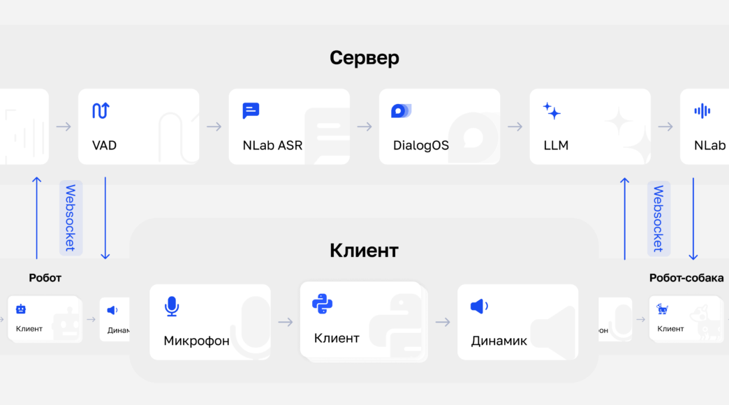«Ключевой задачей при разработке этого комплекса была модульность и независимость от аппаратной платформы. Мы реализовали клиент-серверную архитектуру, где на конечном устройстве ‒ будь то робот-собака или промышленный манипулятор ‒ запускается лишь ультралегкий клиент. Вся сложная обработка, включая KWS, VAD и интеграцию с LLM через DialogOS, происходит на сервере. Такой подход позволяет нам гарантировать высокую производительность и качество распознавания независимо от вычислительных мощностей самого робота, а также централизованно обновлять и масштабировать «мозг» всей системы».