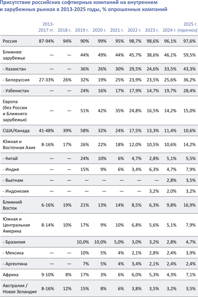 Самый большой прогресс по доле присутствующих российских софтверных компаний наблюдается на рынках Ближнего Востока. Значительное увеличение доли российских компаний наблюдается в странах Ближнего зарубежья. У США и стран ЕС наблюдается ожидаемое сокращение этой доли, но всё-таки незначительное. У Южной и Восточной Азии показатель доли присутствия российских софтверных компаний фактически не изменился. Если доля какого-то географического рынка в этом рейтинге меньше 10%, то судить о реальных изменениях сложно, поскольку значимость случайных факторов возрастает (чем меньше доля, тем больше эта значимость).