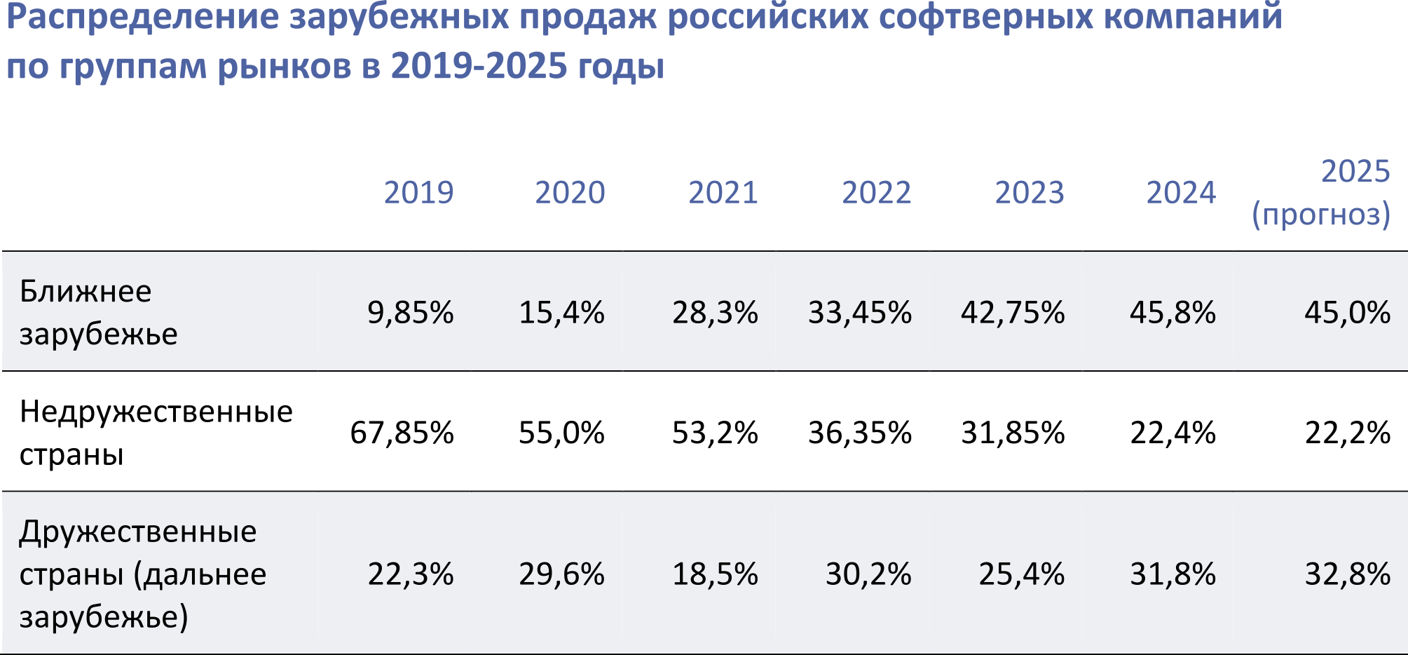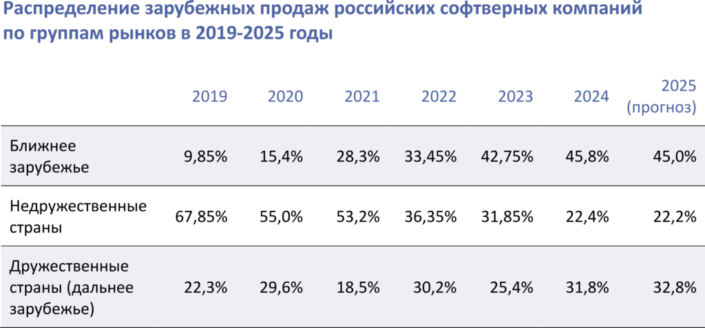 В 2025 г. ожидается резкое увеличение доли российских софтверных компаний, присутствующих на всех рынках «дружественных стран» дальнего зарубежья и на рынках Ближнего зарубежья. При этом необходимо отметить, что, как правило, достичь прогнозируемых показателей по итогам следующего года почти никогда не удаётся.