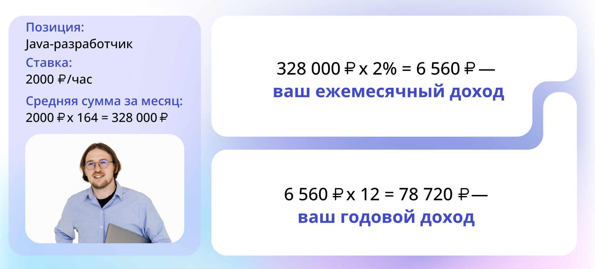 Теперь можно привести на платформу SkillStaff знакомых специалистов и в течение года получать 2% от их дохода. Нужно только зарегистрироваться. Например, вы приглашаете Java-разработчика по реферальной ссылке. Он успешно проходит интервью и выходит на проект. Вот какую сумму можно получить на руки: