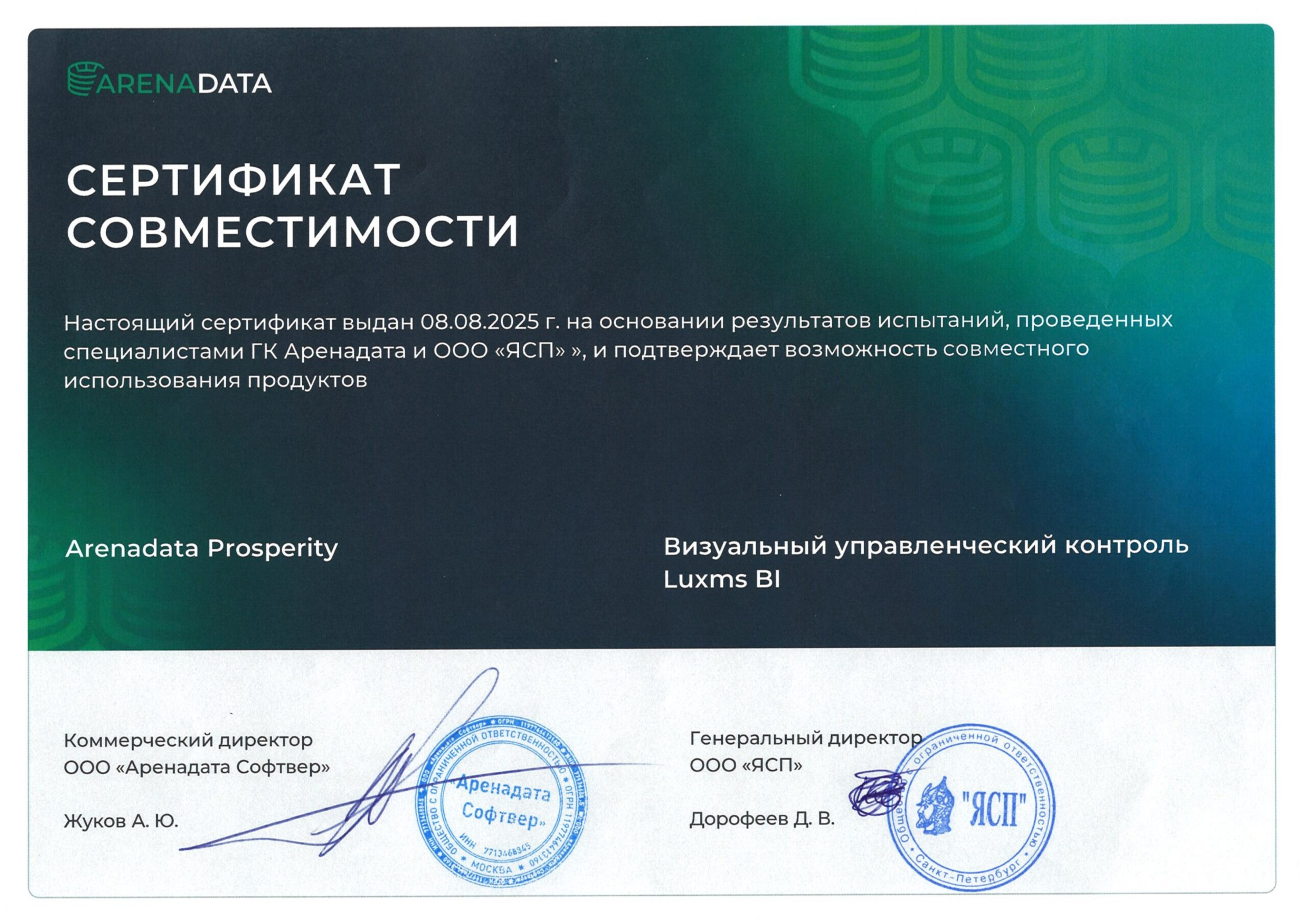 Группа компаний Arenadata и ООО «ЯСП» (ГК Luxms) подтвердили полную совместимость высокопроизводительной универсальной СУБД Arenadata Prosperity (ADP) и платформы бизнес-аналитики Luxms BI.