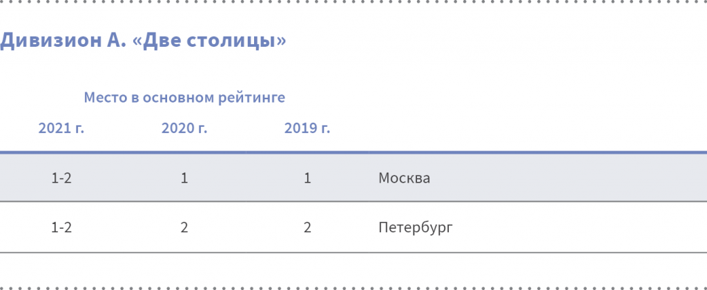 Дивизион представляют Москва и Петербург. Они вне конкуренции. По объективным причинам никакие другие субъекты федерации с ними пока соперничать не могут. По численности населения, по количеству сильных университетов, по размеру экономики у них огромное преимущество перед другими регионами. Оно формировалось не только десятилетиями, а даже столетиями.