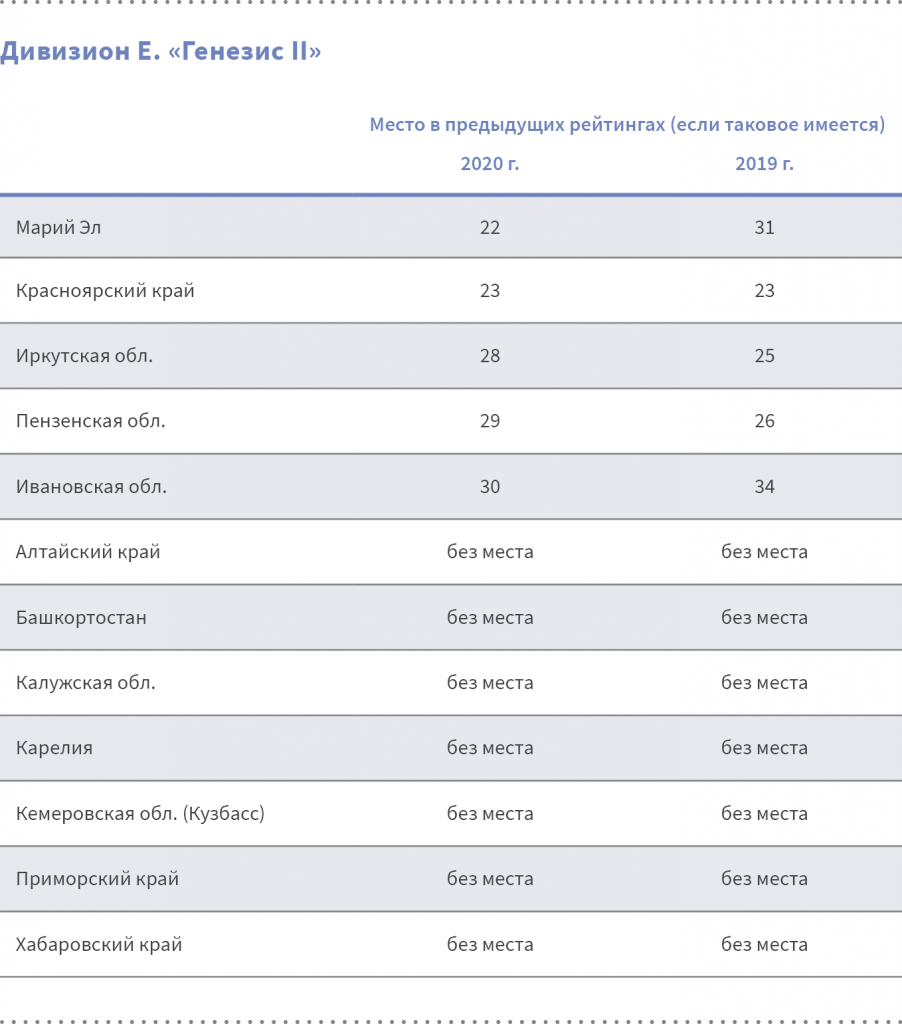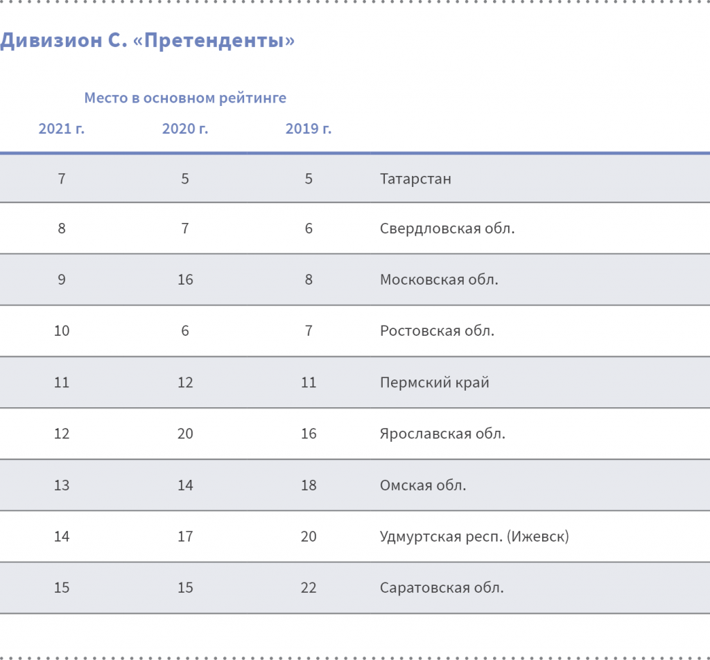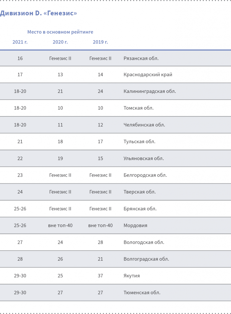 Позиции близкие к тому, чтобы войти в топ-30, из этого дивизиона имеют 12 регионов. По каким-то параметрам они уже входят в тридцатку крупнейших, но оснований для их включения в основной рейтинг пока недостаточно. Все они могут легко перейти в Дивизион D («Генезис») даже за один год.