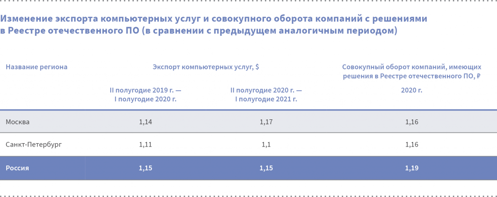 В последние годы показатели роста (как экспорта компьютерных услуг, так и совокупного оборота компаний с решениями в Реестре отечественного ПО) у Москвы и Санкт-Петербурга почти всегда оказывались ниже, чем в среднем у других субъектов федерации. Москва на фоне Петербурга выглядит лучше, но совокупный доход московских компаний растет отчасти за счет того, что некоторые быстро растущие региональные компании переводят головной офис в столицу.
