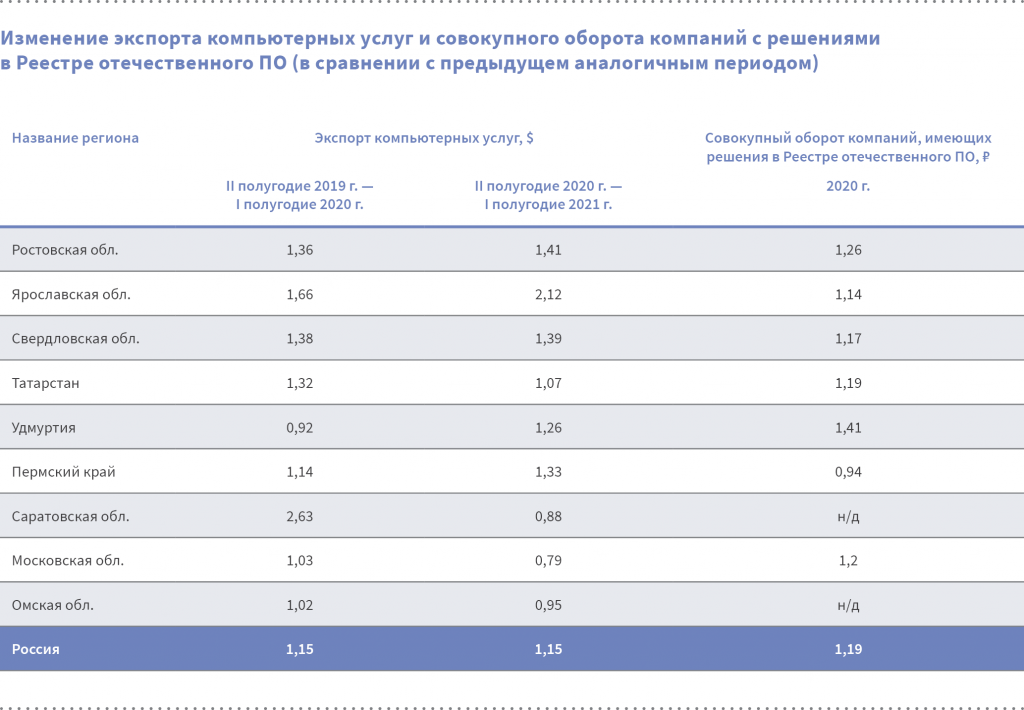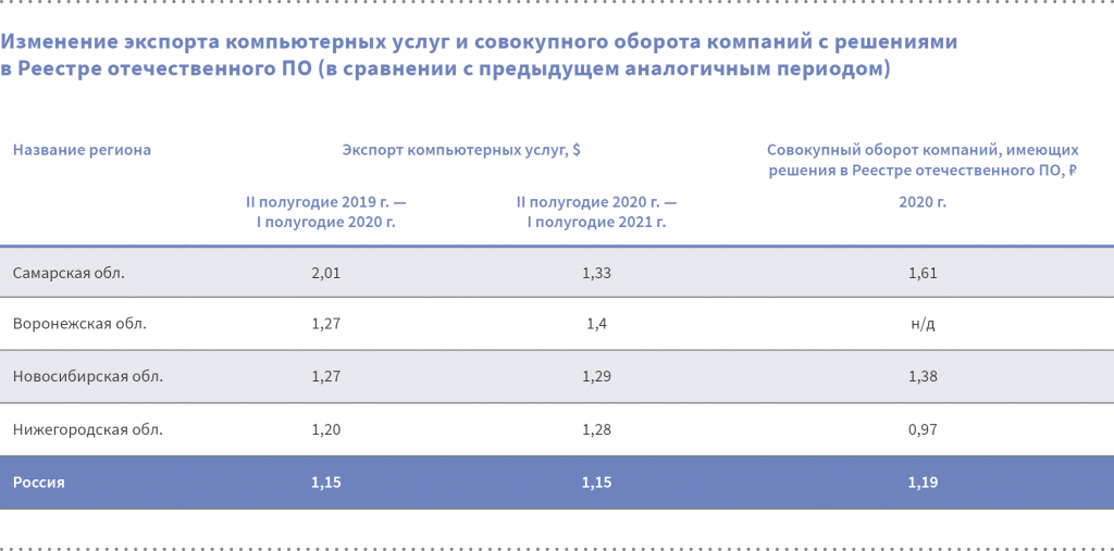 «В связи с пандемией, подстегнувшей спрос на услуги цифровизации, в сфере информационных технологий появилось огромное количество новых проектов, а значит большой пласт работы. Дистанционный наём работников позволил IT-специалистам получать работу в крупных российских и международных компаниях, оставаясь в своих регионах. Это дополнительно способствовало росту доходов региональных софтверных компаний. В разрезе компаний Новосибирской и Омской областей можно также обратить внимание на результаты продуктивного диалога региональной власти с локальными и федеральными некоммерческими ассоциациями IT-компаний. Такое активное, грамотно организованное взаимодействие эффективно стимулирует развитие хорошего экономического климата и способствует гармоничному становлению IT-отрасли в регионах в соответствии с запросами глобального рынка».