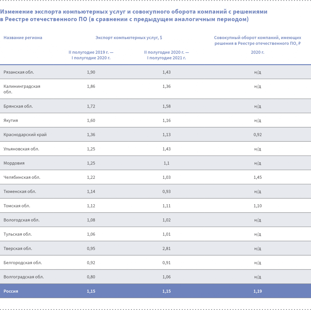 Среди этих регионов выделяется Башкортостан, который по количеству зарегистрированных на hh.ru компаний занимается высокое 14-е место. Однако по совокупному обороту компаний в базе РУССОФТ — у Башкортостана уже 21-е место, по объему экспорта компьютерных услуг — 35-е, а по количеству сотрудников удаленных центров разработки — 44-е.