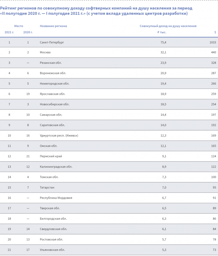 В рейтинге по совокупному доходу софтверных компаний на душу населения учитывается вклад удаленных центров разработки компаний из других городов, расположенных в этих регионах. В нем производится ранжирование только тех регионов, которые попали в основной рейтинг, поскольку лишь по ним рассчитывался совокупный доход софтверных компаний. В среднем по России этот показатель составляет ₽9,6 тыс. ($130).