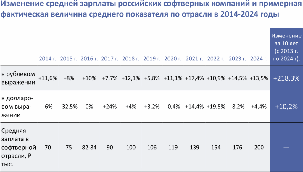 Тем не менее, относительно небольшое присутствие российских аутсорсинговых компаний на рынках Европы и США сохраняется. Потому важно отметить, что за последние 10 лет средняя зарплата профильных технических сотрудников софтверных компаний повысилась в рублевом выражении на 218%, а в долларовом — только на 10%.