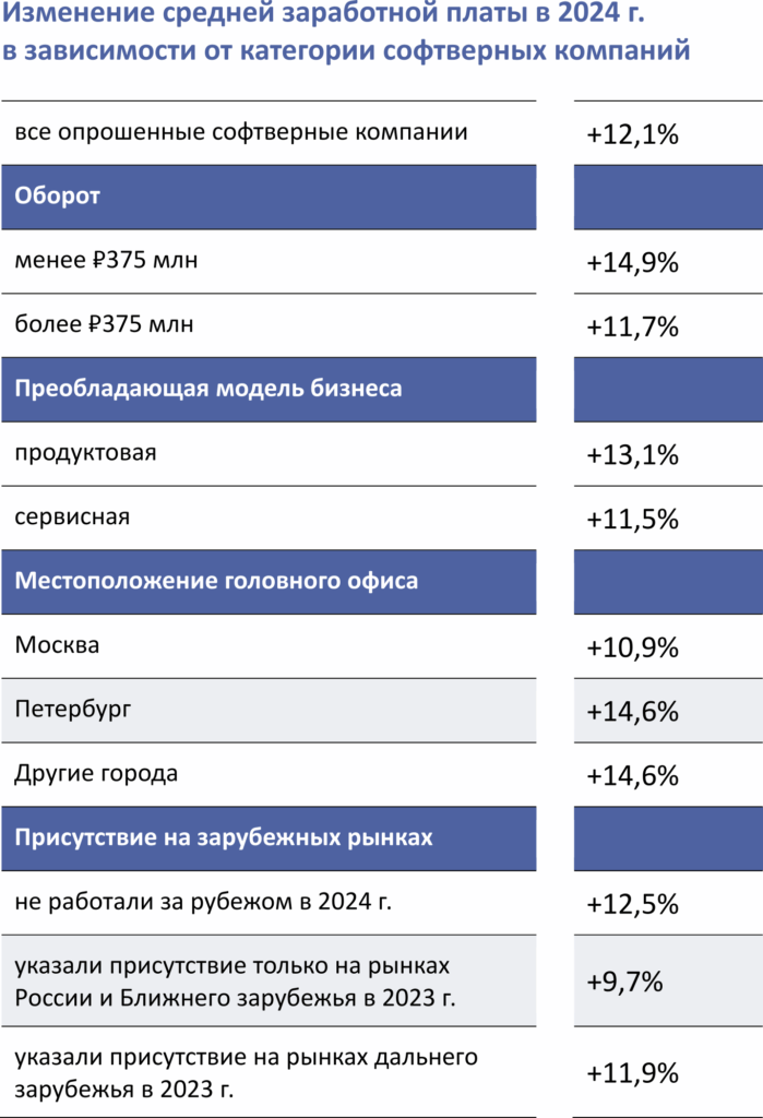 Изменение средней зарплаты у разных категорий софтверных компаний в 2024 г. выравнялось (в 2023 г. различия были больше). По-прежнему быстрее растет зарплата у небольших компаний с оборотом до менее ₽375 млн, чем у компаний большего размера. Также неизменным осталось то, что опережающие темпы роста зарплат имеют региональные компании относительно московских, а также продуктовые компании относительно сервисных.
