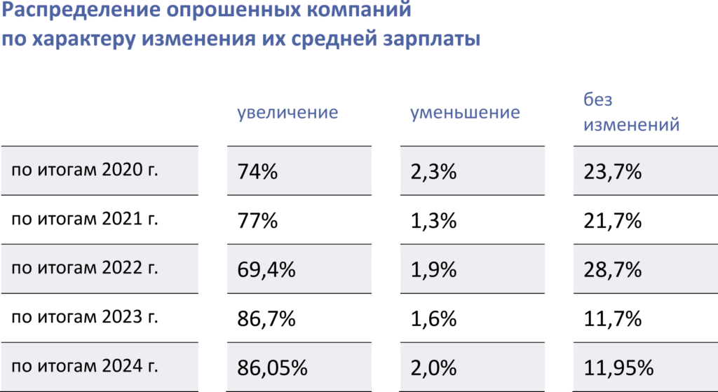 По итогам 2024 г. распределение компаний по изменению средней зарплаты почти совпадает с распределением 2023 г., но доля компания с ростом не менее чем на 20% немного сократилась — с 22,2% до 16%. Можно предположить, что переманивать высокими зарплатами софтверные компании стали реже.