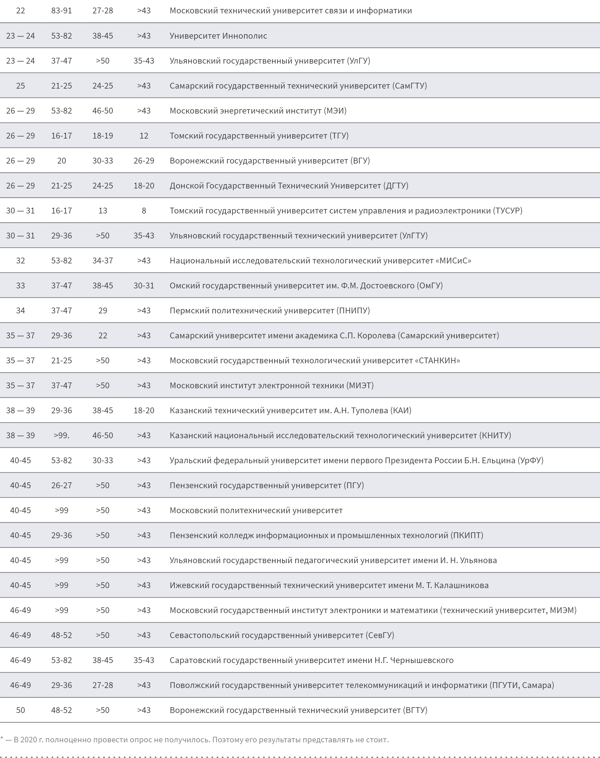 В числе топ-50 учебных заведений можно отметить прогресс двух нижегородских университетов, но следует признать, что прежде они занимали не очень высокие места во многом не из-за низкого качества подготовки ИТ-специалистов, а из-за невысокого представительства компаний Нижегородской области в ежегодном опросе РУССОФТ. СПбГУТ совершил подъем в Рейтинге в предшествующие 3 года, а в 2023 году закрепился на занятой позиции. Можно также отметить прогресс МИРЭА – Российского технологического университета, Пермского государственного университета (ПГНИУ) и Ульяновского государственного университета (УлГУ).