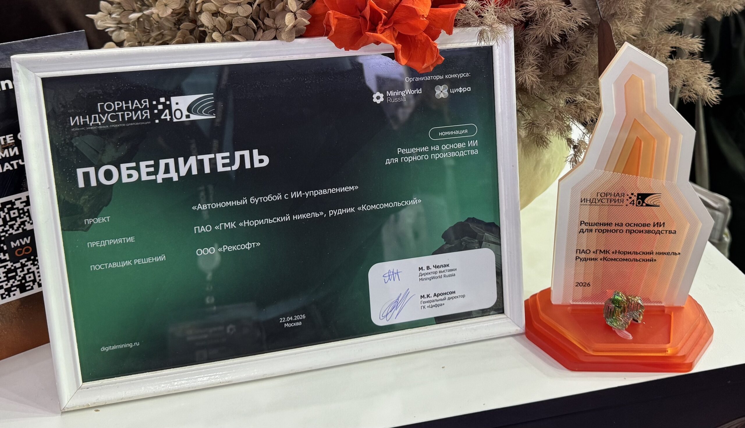 Совместная разработка технологической компании Рексофт и «Норильского Никеля» – «Автономный бутобой с ИИ-управлением» – признана лучшей в конкурсе «Горная индустрия 4.0» в номинации «Решение на основе ИИ для горного производства». Решение предназначено для повышения эффективности работы рудников и усиления уровня промышленной безопасности при выполнении технологических процессов дробления негабаритов.
