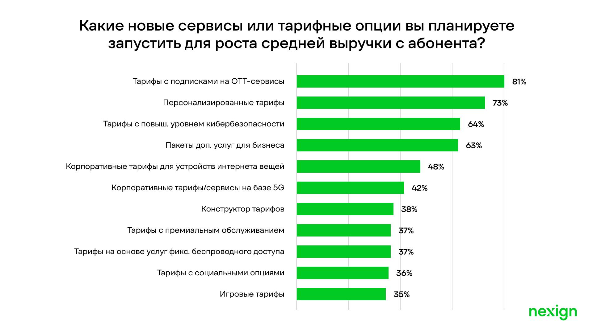 Рост средней выручки с абонента также планируется повышать с помощью запуска персонализированных тарифов (73%) и тарифов с усиленной кибербезопасностью (примерно 65%), премиальных тарифов и услуг фиксированного беспроводного доступа (оба по 37%). Таким образом в ближайшие годы можно ожидать заметный рост доли комплексных тарифных предложений с киберзащитой, хранением данных, доступом к медиаконтенту и возможностью гибкой адаптации под конкретные потребности абонента.