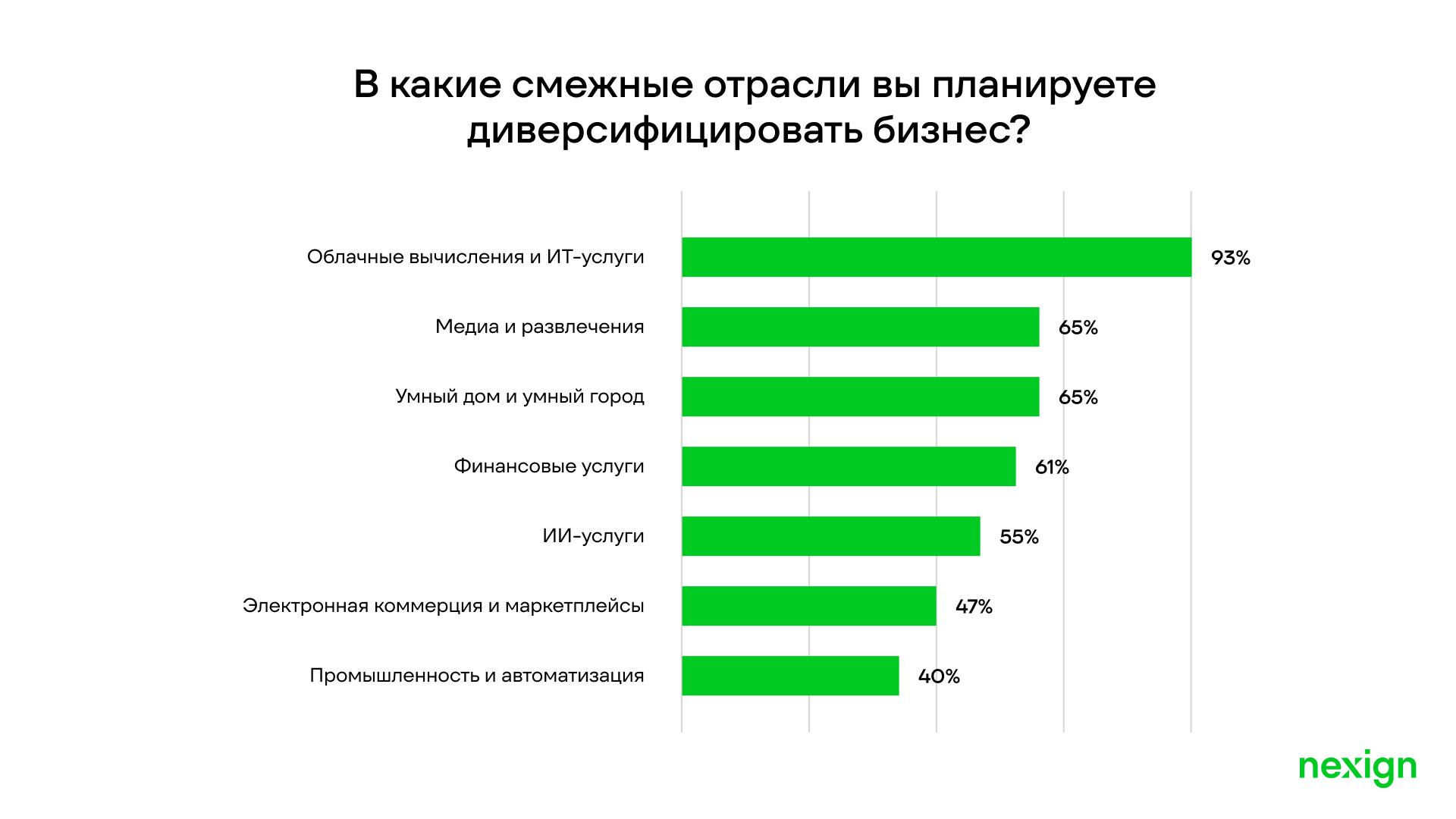 Также операторы проявляют интерес к направлениям медиа/развлечений и умного дома/города (по 65%), финансовых сервисов (61%), ИИ-услуг (55%), электронной коммерции (47%), промышленности (40%). Нишевые направления — такие как телемедицина и образование — остаются в фокусе отдельных игроков (около 20%).