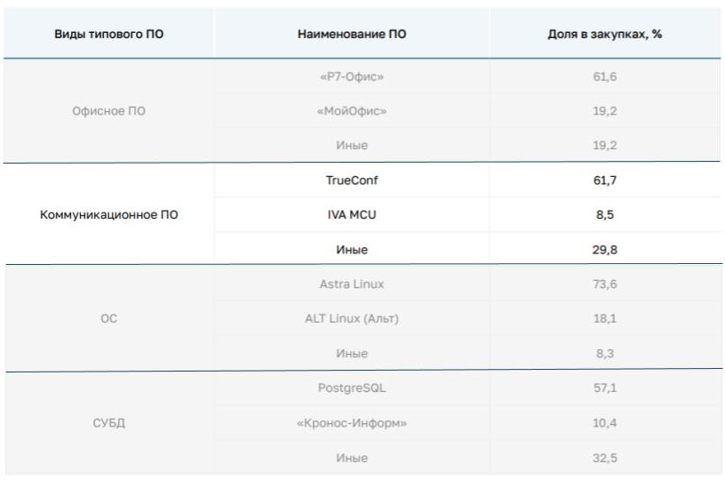 Аудит охватил пять ключевых категорий: средства коммуникации, антивирусы, операционные системы, СУБД и офисные пакеты. В сегменте видеосвязи и обмена сообщениями наибольший объём закупок среди российских производителей занял Труконф.