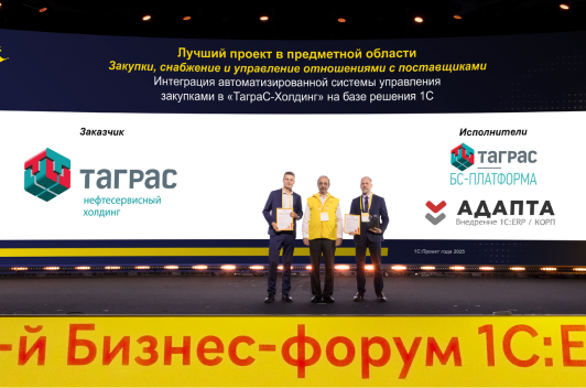 Проект компаний АДАПТА и Про-Ресурс по созданию автоматизированной системы управления закупками для «ТаграС-Холдинга» стал победителем премии «1С:Проект года» в номинации «Закупки, снабжение и управление отношениями с поставщиками».
