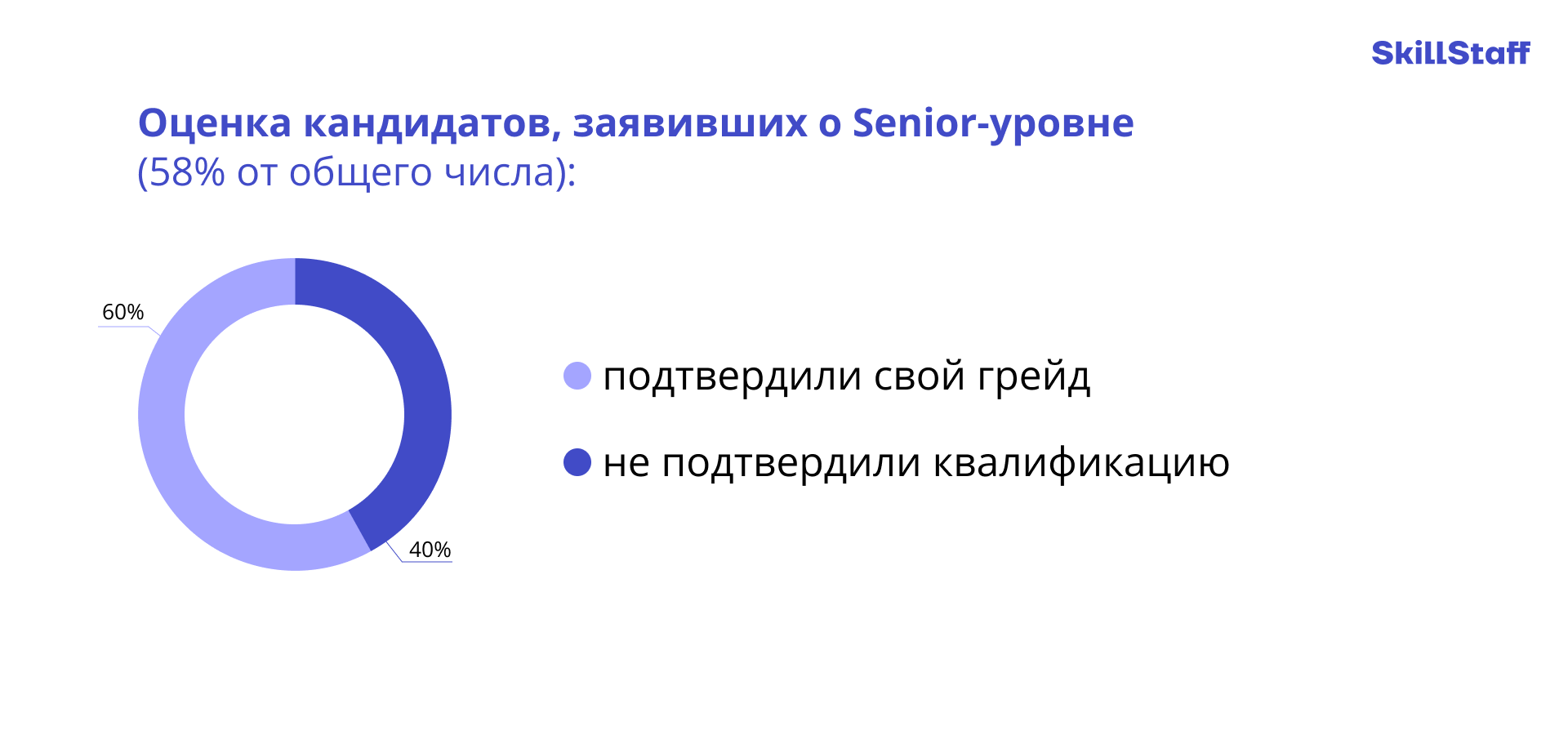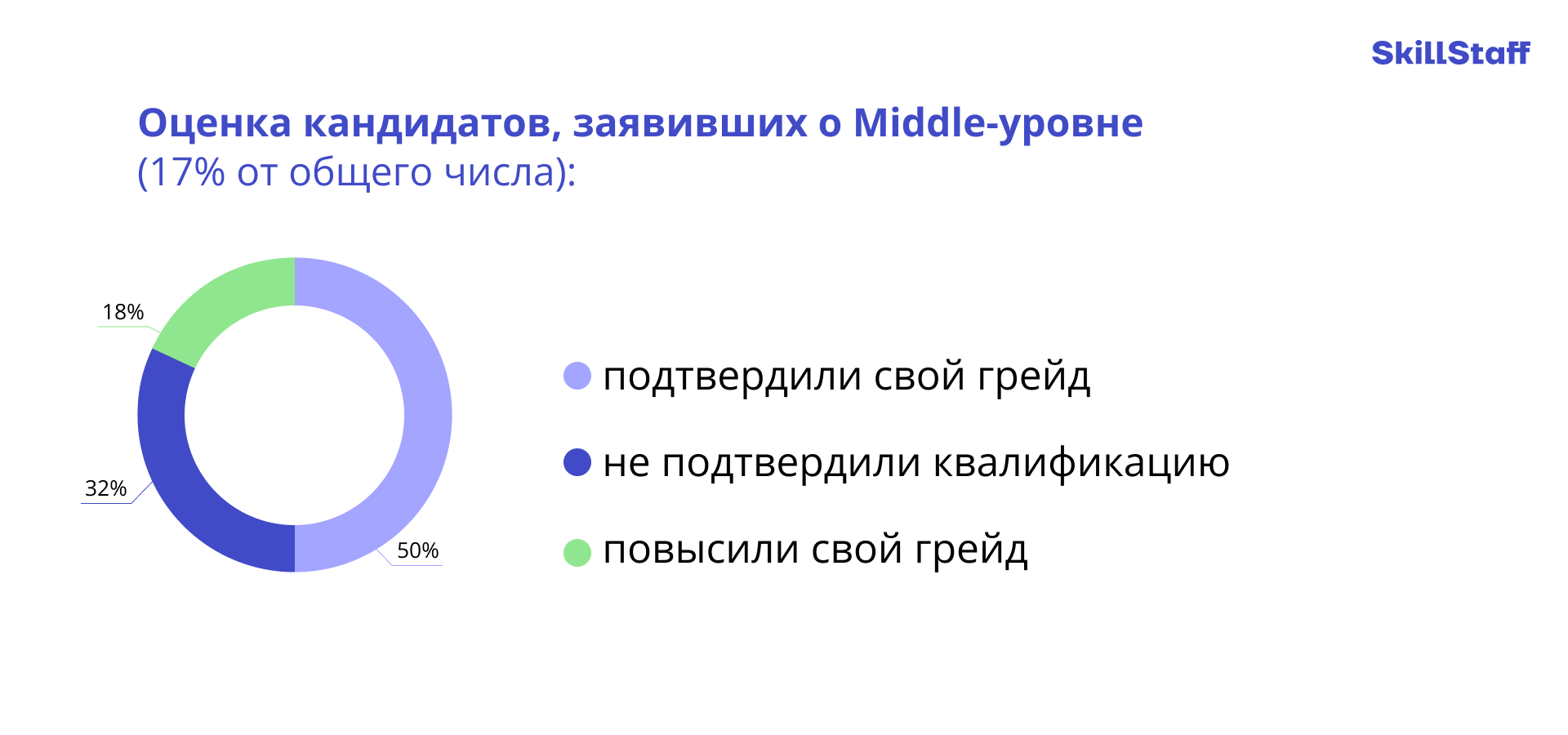 Среди тестируемых уровня Middle (17%),  треть специалистов (32%) не подтвердили свой грейд, 18% согласно результатам повысили свой уровень до Senior.