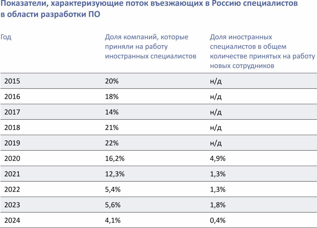 Около 10 лет назад переезд специалистов в Россию (прежде всего из ближнего зарубежья — Украины, Белоруссии, Казахстана) обеспечивал примерно 20% пополнения совокупного штата софтверных компаний. В последние 4 года этот показатель не превышал 1,8%, а в 2024 году снизился до 0,4%.