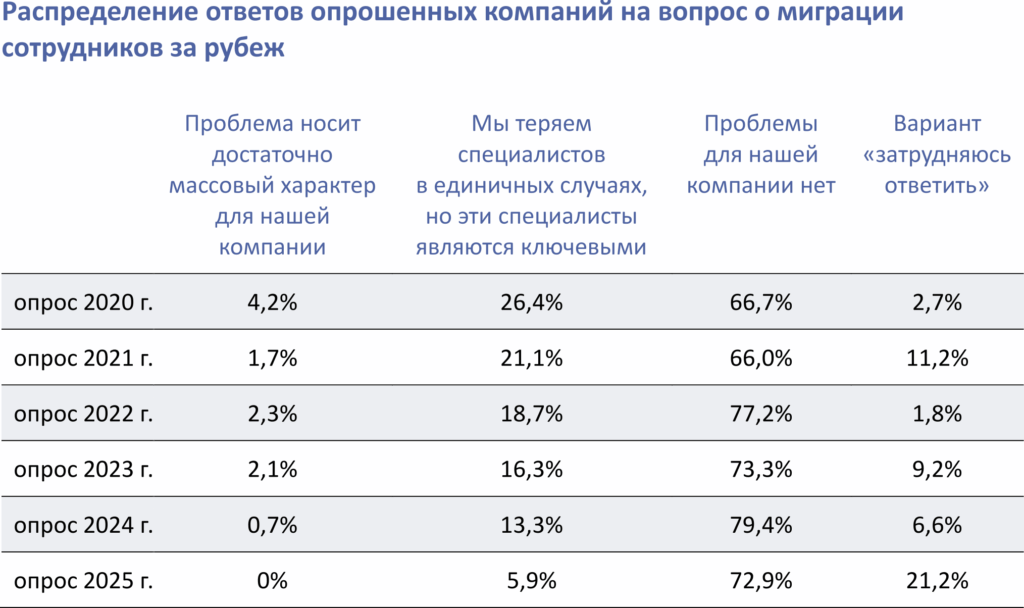 Несмотря на отъезд ИТ-специалистов из России, по результатам опроса 2024 г. оказалось, что доля респондентов, считающих миграцию сотрудников за рубеж проблемой для своей компании, стала намного меньше, чем годом ранее, сократившись с 18,4% до 14%. При этом лишь 0,7% респондентов выбрали вариант ответа «Проблема носит достаточно массовый характер для нашей компании» (годом ранее их доля составляла 2,1%). В 2025 году произошло ещё более значительное снижение этого показателя. Об отъезде сотрудников в единичных случаях сообщило только 5,9% опрошенных софтверных компаний, о массовом характере этих потерь — 0%.